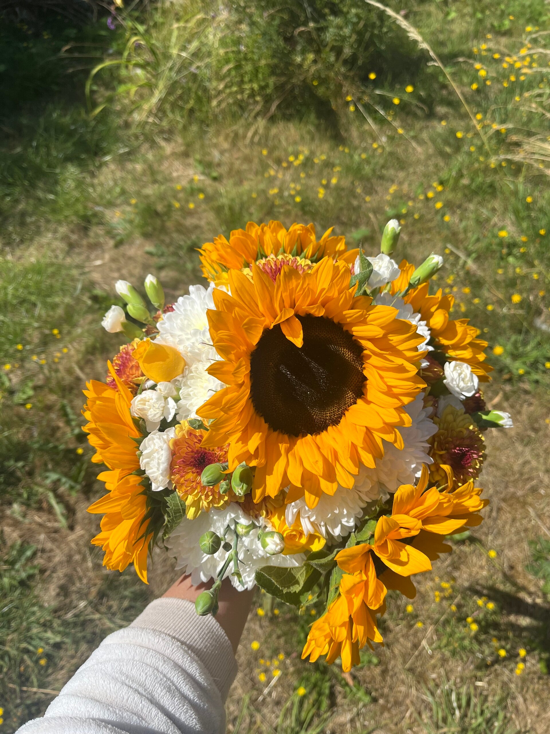 The star of the show will always be Sunflowers in this bouquet; the filler flowers will change depending on what's in season. For example, these could be Stocks, Germini, Alstroemeria, or Baby's Breath.